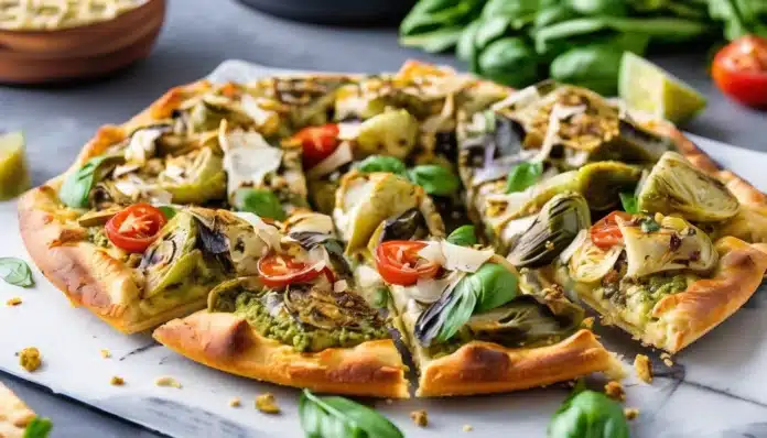- Add Toppings: Layer the cooked chicken, chopped artichoke hearts, sun-dried tomatoes, and red onion evenly over the pesto. Sprinkle the shredded mozzarella and grated Parmesan cheese on top. For a spicy kick, add crushed red pepper flakes.