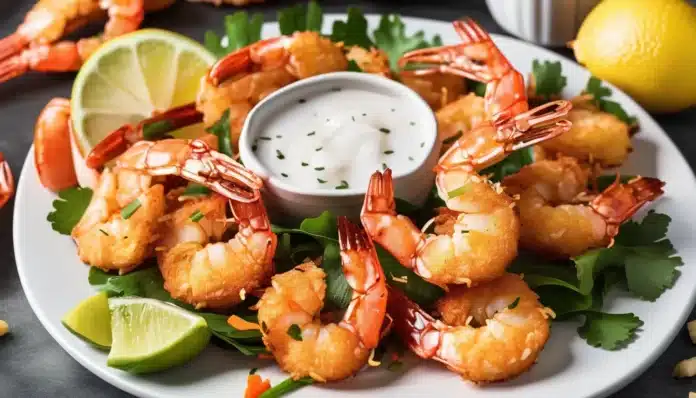 - Serve the Air Fryer Coconut Shrimp hot with lime wedges and the dipping sauce on the side.
