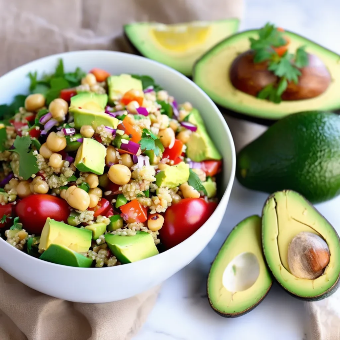 Avocado & Garbanzo Bean Quinoa Salad is a fresh and nutritious dish that’s perfect for a light lunch or a side at dinner. This salad combines the fluffy texture of quinoa with the creamy richness of avocado, the protein-packed goodness of garbanzo beans, and a medley of colorful vegetables. Tossed in a zesty lemon or lime vinaigrette, it’s a refreshing and satisfying meal that’s both delicious and healthy. Easy to prepare and full of flavor, it’s an excellent choice for a wholesome meal.