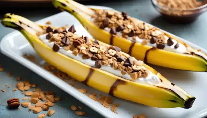 - Prepare the bananas: Slice each banana lengthwise down the center, being careful not to cut all the way through the bottom peel. Gently open the banana to create a pocket for the toppings.