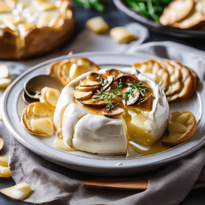Baked Brie with Roasted Garlic is an elegant yet simple appetizer that combines the creamy, rich texture of warm Brie cheese with the deep, mellow flavor of roasted garlic. The gooey Brie contrasts beautifully with the sweet, caramelized garlic cloves, creating a dish that is both indulgent and sophisticated. This recipe is perfect for entertaining, as it can be prepared quickly and pairs wonderfully with crusty bread, crackers, or fresh fruit. Whether served at a casual gathering or a formal dinner, Baked Brie with Roasted Garlic is sure to impress your guests.