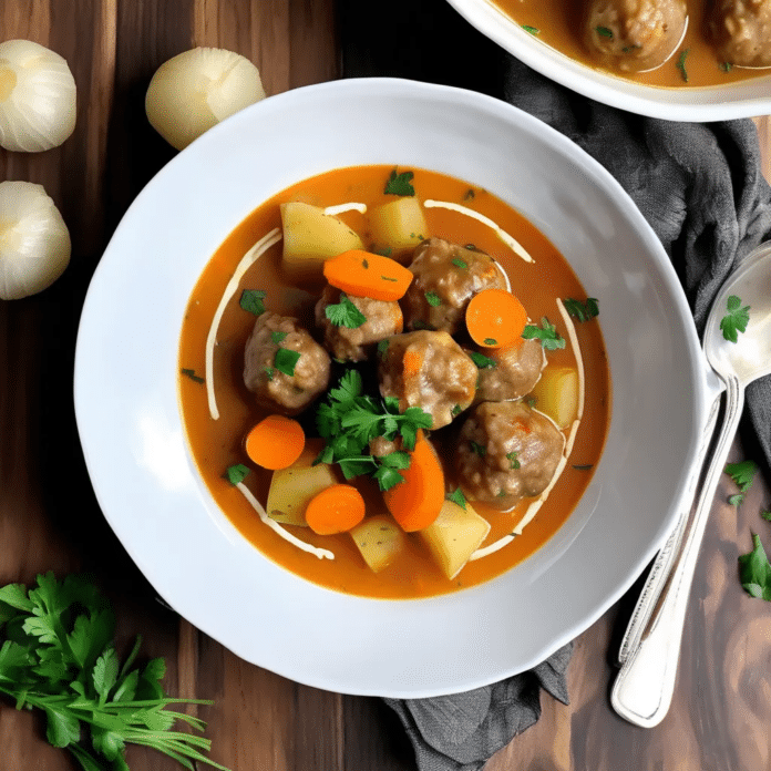 Bavarian Meatball Stew is a hearty and comforting dish that brings the rich, traditional flavors of Bavarian cuisine to your table. This stew features tender, flavorful meatballs simmered in a savory broth with potatoes, carrots, and onions, all enhanced with the subtle tang of mustard and the warmth of spices. The meatballs are made with a mix of ground meats, breadcrumbs, and herbs, creating a melt-in-your-mouth texture that pairs perfectly with the rustic vegetables. This stew is ideal for a cozy family dinner or a satisfying meal on a chilly day, offering a taste of Bavaria in every spoonful.