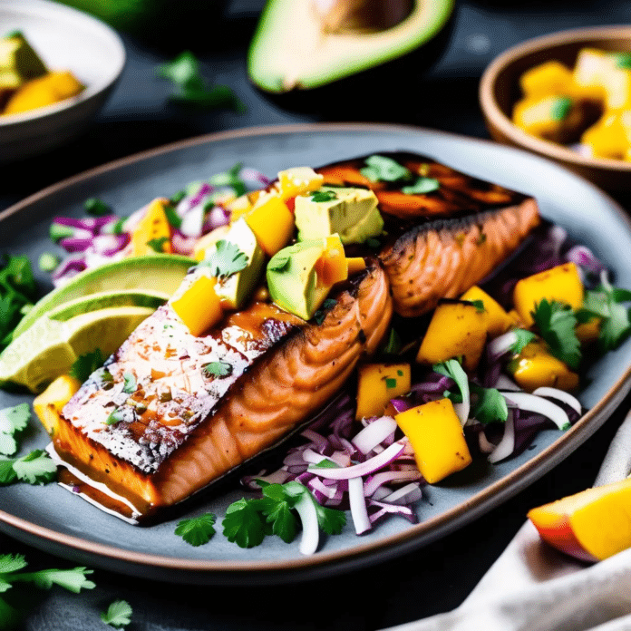 BBQ Salmon Curry with Mango Avocado Salsa is a vibrant fusion dish that brings together the smoky sweetness of BBQ salmon with the rich, spicy flavors of a curry glaze, all topped with a refreshing and zesty mango avocado salsa. The succulent salmon is brushed with a tangy BBQ curry sauce and grilled or baked to perfection, while the fresh salsa adds a bright contrast with juicy mangoes, creamy avocado, and lime. This dish is an exciting blend of sweet, smoky, and spicy, perfect for a light and flavorful dinner that transports you to the tropics.