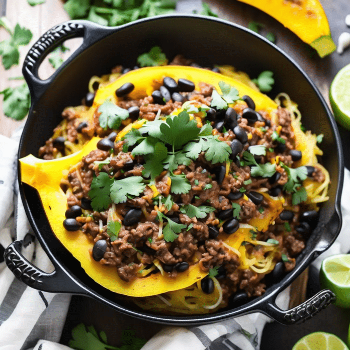Beef and Black Bean Spaghetti Squash is a wholesome and flavorful dish that swaps out traditional pasta for roasted spaghetti squash, creating a lighter yet satisfying meal. The tender strands of spaghetti squash are mixed with savory ground beef, hearty black beans, and a blend of spices, offering a delicious and protein-packed alternative to typical pasta dishes. Topped with fresh cilantro and a squeeze of lime, this dish is perfect for anyone looking for a healthy, gluten-free meal that’s still full of flavor.