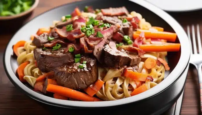 Beef Burgundy, or Boeuf Bourguignon, is a classic French dish that transforms humble beef into a gourmet delight. The rich, slow-cooked beef is simmered in a luxurious red wine sauce, infused with earthy mushrooms, savory onions, and aromatic herbs. This dish is the epitome of comfort food, perfect for a special occasion or a cozy night in. Served over tender egg noodles, the sauce seeps into every crevice, creating a meal that is as satisfying as it is indulgent. Whether you’re a fan of French cuisine or simply love a hearty beef dish, Beef Burgundy Over Noodles will quickly become a favorite in your recipe collection.
