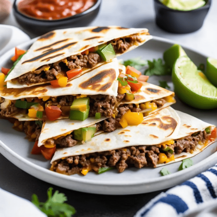 - Assemble the Quesadillas: Heat a clean skillet over medium heat. Butter one side of a tortilla and place it in the skillet, buttered side down. Sprinkle a layer of shredded cheddar and Monterey Jack cheese over half of the tortilla. Add a generous portion of the beef mixture on top of the cheese, then sprinkle more cheese on top of the beef. Fold the tortilla over to enclose the filling.