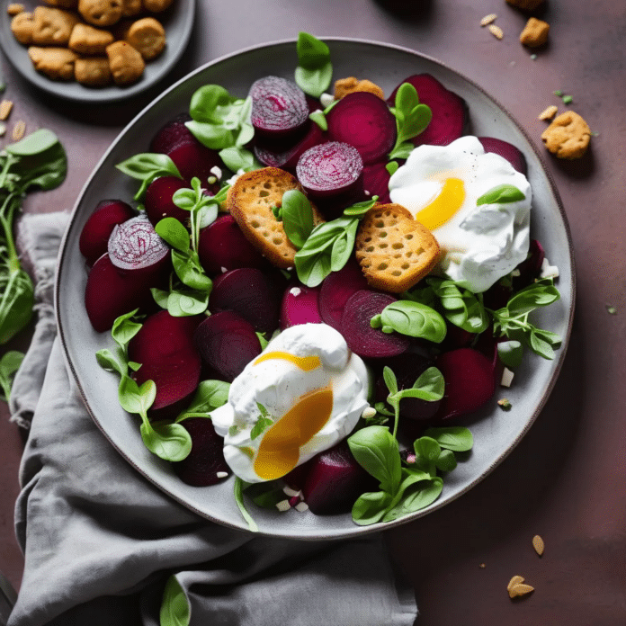 Beet and Burrata Salad with Fried Bread is a delightful combination of earthy, sweet beets, creamy burrata, and the satisfying crunch of golden fried bread. This salad offers a beautiful balance of textures and flavors, making it a standout dish for any occasion. The roasted beets bring a deep, rich flavor that pairs perfectly with the mild, buttery burrata, while the fried bread adds a rustic, crunchy element that elevates the entire salad. Finished with a drizzle of balsamic glaze and a sprinkle of fresh herbs, this salad is as visually stunning as it is delicious, making it perfect for a light lunch or a dinner party starter.
