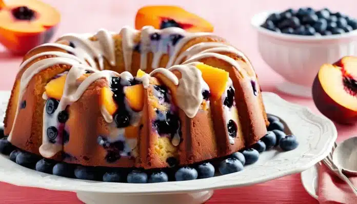 This delightful Blueberry-Peach Pound Cake combines the sweetness of ripe peaches with the tangy burst of blueberries, all enveloped in a buttery, moist cake. It’s perfect for a summer dessert or a delightful treat with your morning coffee. The cake’s tender crumb is balanced by the juicy fruits, creating a harmonious blend of flavors that captures the essence of summer. Whether you’re serving it for a special occasion or enjoying it as a simple indulgence, this pound cake is sure to be a hit with everyone who tries it.