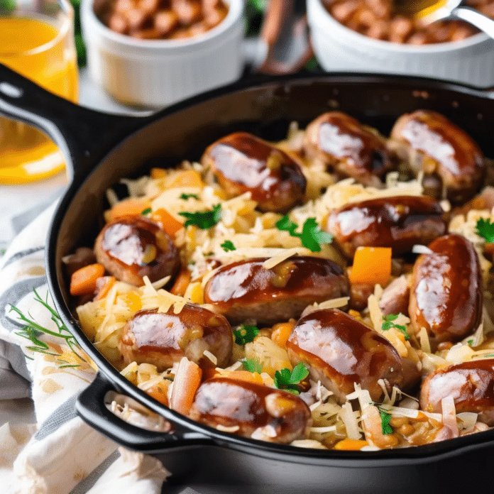 Bratwurst, Sauerkraut, and Bean Casserole is a hearty and flavorful dish that brings the comforting tastes of German cuisine to your dinner table. This casserole combines juicy bratwurst sausages with tangy sauerkraut and hearty beans, all baked together in a savory sauce that blends mustard, brown sugar, and spices for a rich, balanced flavor. The dish is layered with caramelized onions and smoky bacon, adding depth and richness that complements the mild spiciness of the bratwurst. Perfect for a cozy family dinner or a potluck, this casserole is easy to prepare and satisfies a crowd. Serve it with crusty bread or mashed potatoes for a complete, warming meal that’s full of character and taste.