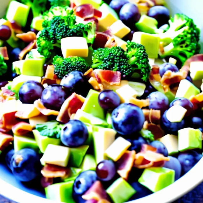 - Prepare the ingredients: In a large mixing bowl, combine the chopped broccoli, halved grapes, crumbled bacon, red onion, and sunflower seeds. If you’re adding cheese, mix it in as well.