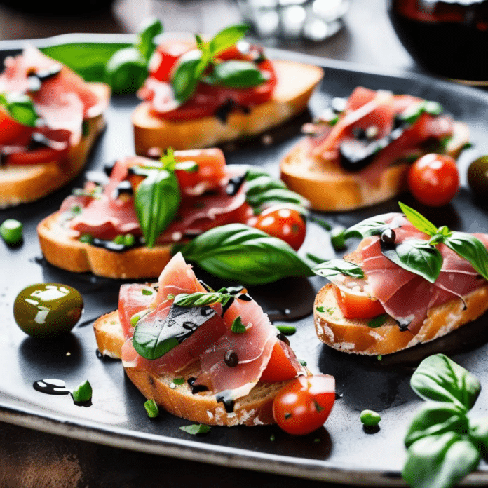 Bruschetta with Prosciutto is an elegant and flavorful appetizer that combines the classic freshness of ripe tomatoes and basil with the savory richness of prosciutto. The crunchy toasted bread provides the perfect base for the juicy, tangy tomato mixture, while the thinly sliced prosciutto adds a salty depth that elevates this simple dish to a gourmet experience. Drizzled with olive oil and balsamic glaze, this bruschetta makes for a delightful starter, perfect for entertaining or enjoying as a light snack. It’s a harmonious blend of textures and flavors that brings out the best in each ingredient.