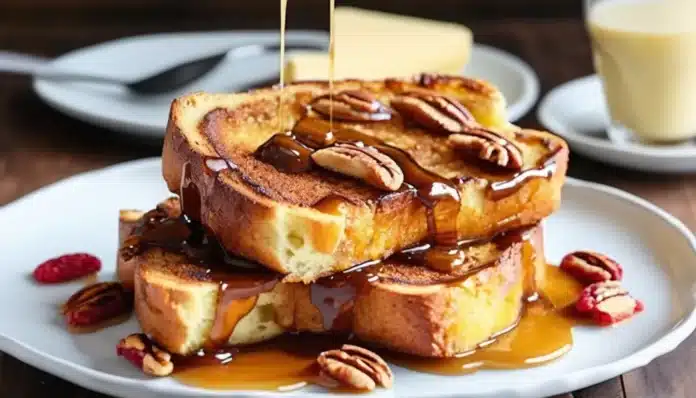 - Serve: Plate the French toast and generously spoon the butter pecan sauce over the top. Serve immediately, with extra maple syrup on the side if desired.