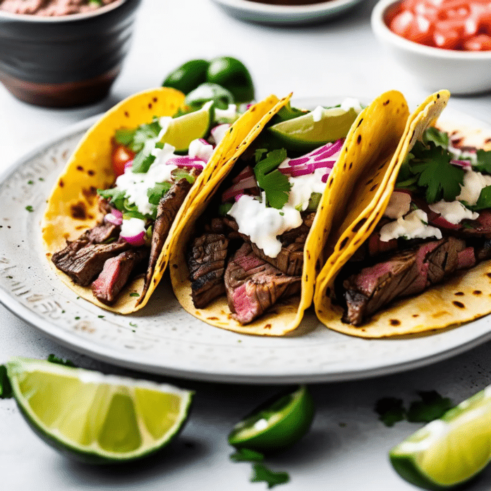4. Assemble the tacos: Slice the grilled steak into thin strips. Place a few strips of steak into each tortilla and top with diced onion, chopped cilantro, and a squeeze of fresh lime juice. Add salsa, avocado, or hot sauce if desired.