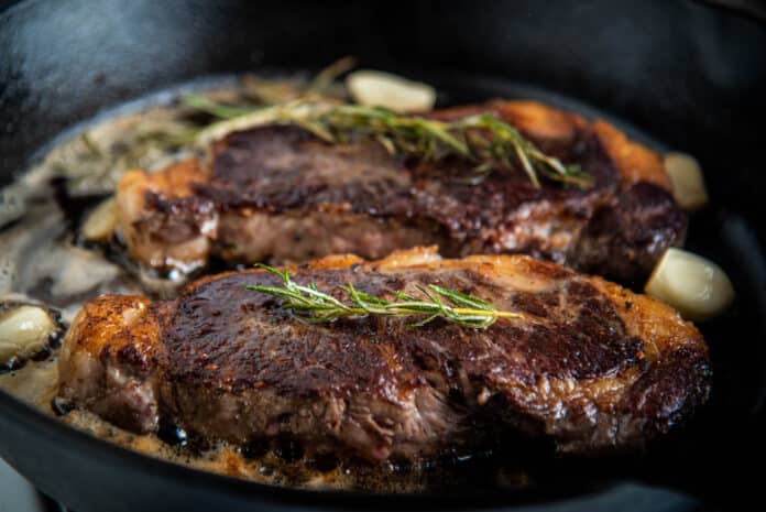 - Tilt the skillet slightly and use a spoon to continuously baste the steaks with the melted butter and aromatics for about 1-2 minutes.