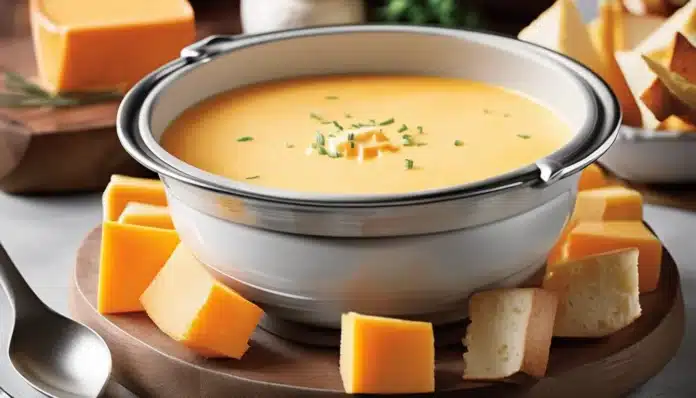 - Serve: Lower the heat to maintain a gentle simmer and serve the fondue immediately with an assortment of dippers like cubed bread, steamed vegetables, and apple slices.