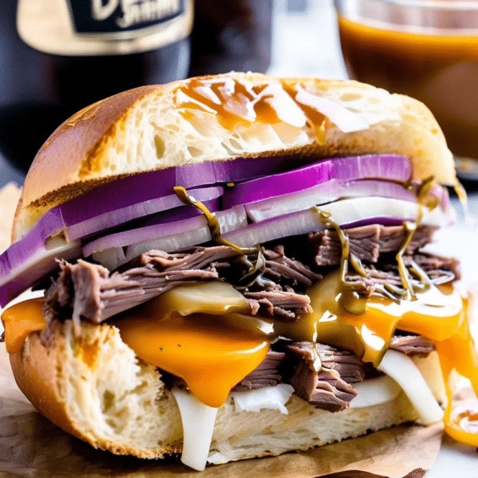 These Cheddar French Dip Sandwiches are the perfect blend of savory and cheesy, offering a warm, comforting meal that’s easy to prepare. The tender roast beef, infused with herbs and spices, is layered with sharp cheddar cheese inside a toasted roll. The sandwich is then served with a rich, flavorful au jus made from beef drippings and broth, perfect for dipping. This dish is a crowd-pleaser, whether you’re hosting a game day gathering or simply craving a hearty, satisfying sandwich.