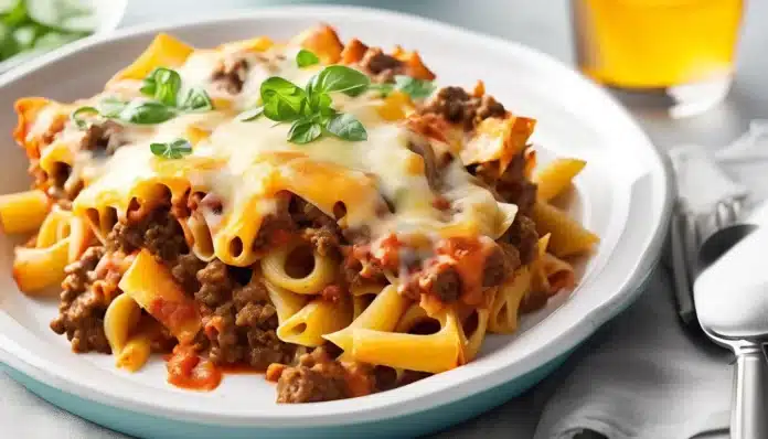 5. Combine: In a large mixing bowl, combine the cooked pasta, beef mixture, half of the mozzarella cheese, cheddar cheese, and ricotta cheese (if using). Mix well to combine everything evenly.