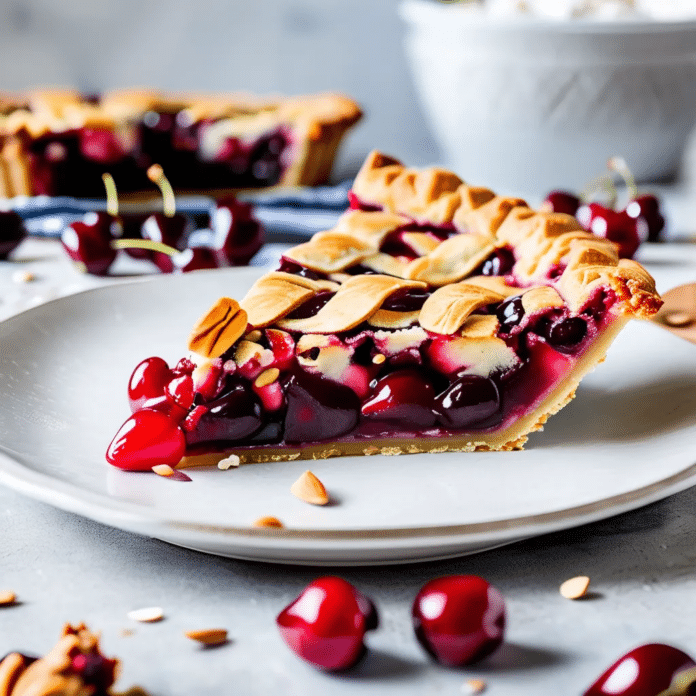 Cherry Almond Pie is a delightful twist on the classic cherry pie, adding a rich, nutty flavor to the sweet-tart cherries with the addition of almond extract and a flaky almond crust. This pie features a buttery, golden crust that encases a luscious cherry filling, enhanced with the subtle warmth of almond. The combination of juicy cherries and the crunch of sliced almonds on top creates a perfect balance of textures and flavors. Ideal for a summer gathering or a festive holiday dessert, this pie is a treat that will satisfy any sweet tooth and leave a lasting impression on your guests.