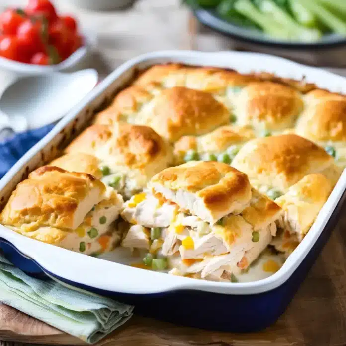 - Serve: Let the casserole cool for a few minutes before serving. Enjoy the comforting flavors of chicken, vegetables, and biscuits in every bite.