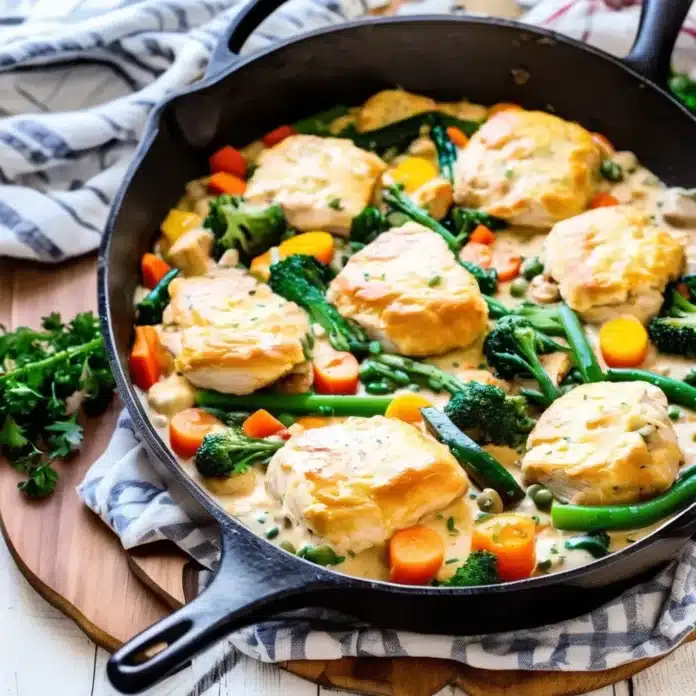Chicken Biscuit Skillet is a comforting, one-pan meal that combines tender pieces of chicken with fluffy, golden biscuits in a creamy, savory sauce. The dish is rich and hearty, making it perfect for a cozy family dinner or when you’re in need of comfort food. The chicken is cooked with vegetables and a flavorful sauce, then topped with biscuits that bake to a crisp, golden brown right in the skillet. This meal is easy to prepare and offers all the satisfaction of a classic chicken pot pie but with a biscuit twist.