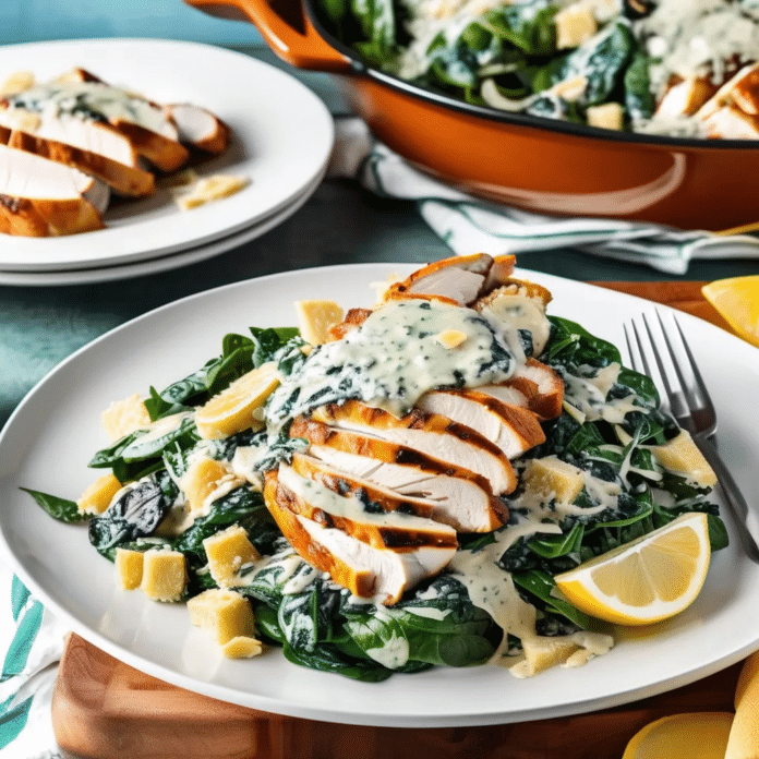 Enjoy your Chicken Caesar Florentine, a perfect blend of creamy Caesar dressing and rich spinach for a hearty, flavorful meal!