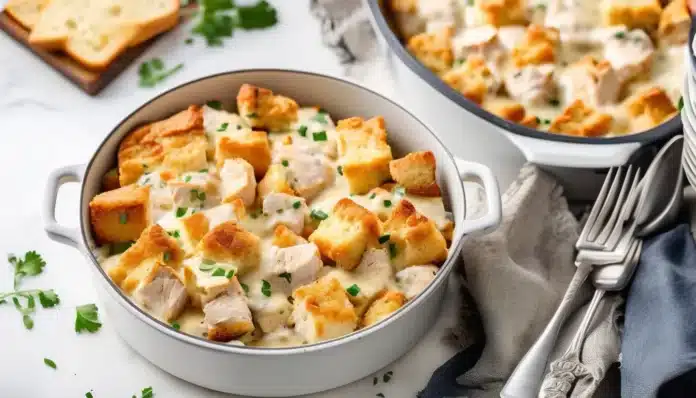 - Top with Croutons: In a separate bowl, toss the croutons with melted butter until they are well-coated. Sprinkle the croutons evenly over the chicken mixture in the baking dish.