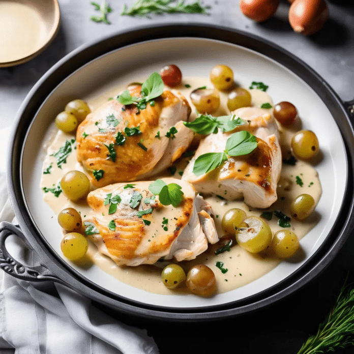 - Serve: Transfer the chicken to a serving platter, spoon the sauce and grapes over the top, and garnish with fresh tarragon sprigs if desired. Serve immediately.