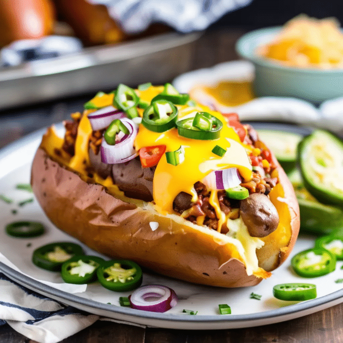 Chili Dog Baked Potatoes take the comforting flavors of a classic chili dog and combine them with the hearty satisfaction of a baked potato. This dish features fluffy baked potatoes loaded with savory beef chili, topped with sliced hot dogs, melted cheese, and a sprinkle of onions and jalapeños for a bit of heat. It’s the perfect fusion of two favorite comfort foods, making for a filling, flavorful meal that’s fun to eat and easy to make. Whether for a family dinner or a casual get-together, these chili dog baked potatoes will be a hit with both kids and adults.