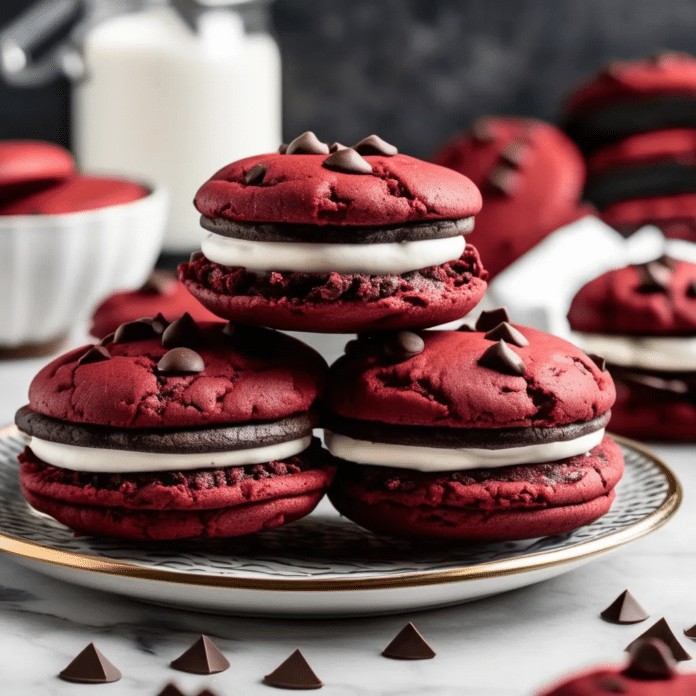 Chocolate chip red velvet whoopie pies are a decadent and visually stunning treat, combining the rich flavor of red velvet with the indulgent sweetness of chocolate chips. These soft and fluffy cookie sandwiches are filled with a creamy, sweet cream cheese frosting, offering the perfect balance of flavors and textures. The chocolate chips add an extra layer of richness that pairs beautifully with the subtle cocoa flavor of the red velvet. Perfect for parties, holidays, or a fun twist on the classic whoopie pie, these desserts are sure to impress both in taste and appearance.
