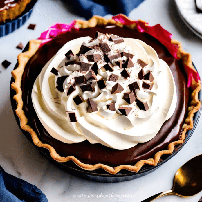 6. Assemble and Serve: Top the chilled pie with whipped cream and garnish with chocolate shavings or curls. Slice and serve.