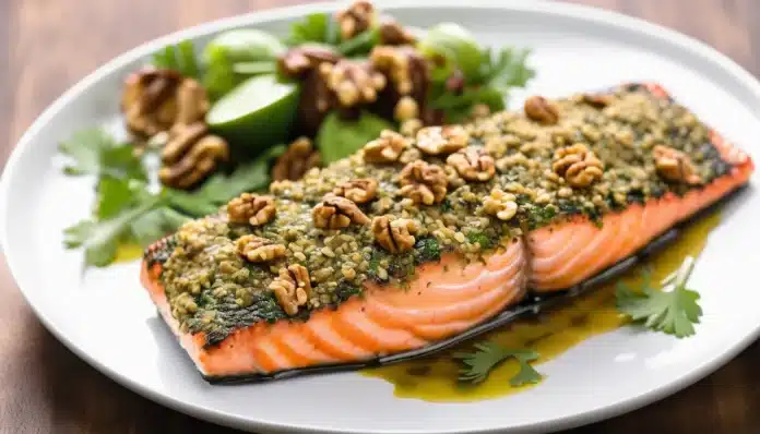 Enjoy this Cilantro and Walnut Crusted Salmon as a healthy and flavorful main course that’s sure to impress!
