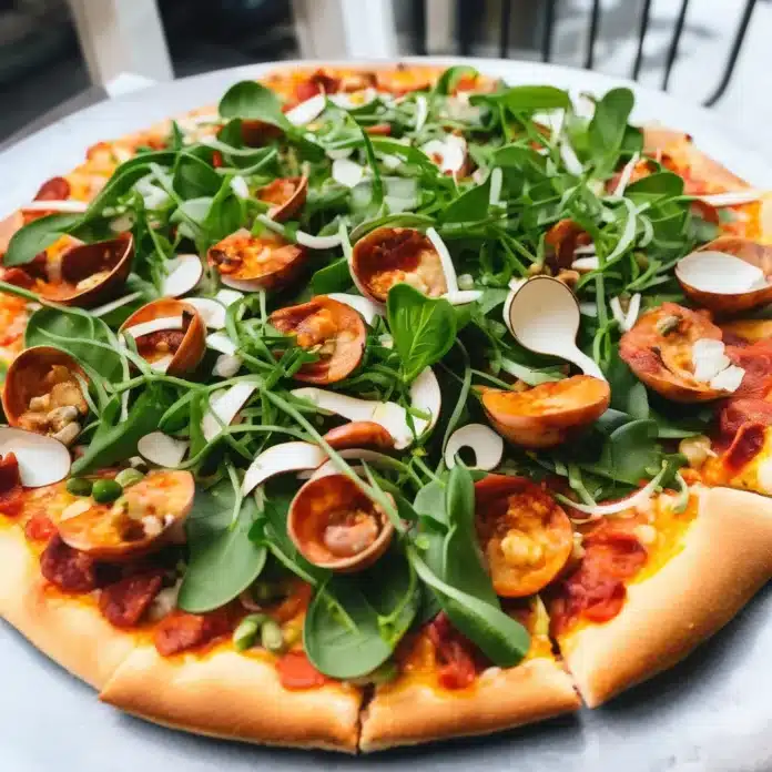 Clam and Chorizo Pizza with Arugula Salad is a gourmet twist on traditional pizza, combining the rich and savory flavors of clams and spicy chorizo with the freshness of a simple arugula salad. The briny sweetness of clams pairs beautifully with the robust, smoky taste of chorizo, while a sprinkle of mozzarella and Parmesan cheeses adds creamy richness. Topped with a fresh, peppery arugula salad tossed in a light lemon vinaigrette, this pizza is an exciting mix of flavors and textures, perfect for a special dinner or to impress guests at your next gathering.