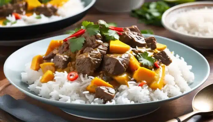 Coconut Mango Thai Beef Curry is a delightful fusion of flavors that brings the taste of Thailand to your kitchen. The creamy coconut milk and sweet mango perfectly complement the tender beef and aromatic spices, creating a dish that’s both comforting and bursting with exotic flavors.