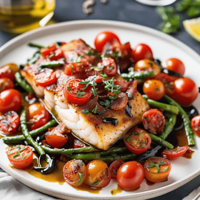Cod with Bacon & Balsamic Tomatoes is a delightful dish that brings together tender, flaky cod with the rich, smoky flavor of bacon and the tangy sweetness of balsamic-infused tomatoes. The combination of the mild, delicate fish with crispy bacon and caramelized tomatoes creates a harmonious blend of textures and flavors. This simple yet elegant dish is perfect for a quick weeknight dinner or a special occasion, offering a light and satisfying meal that pairs beautifully with rice, quinoa, or roasted vegetables.