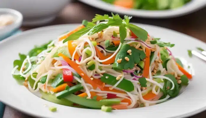 4. Assemble the salad: In a large bowl, toss the cooled noodles with the vegetables, green onions, and cilantro. Pour the dressing over the salad and toss everything together until the noodles and vegetables are evenly coated.