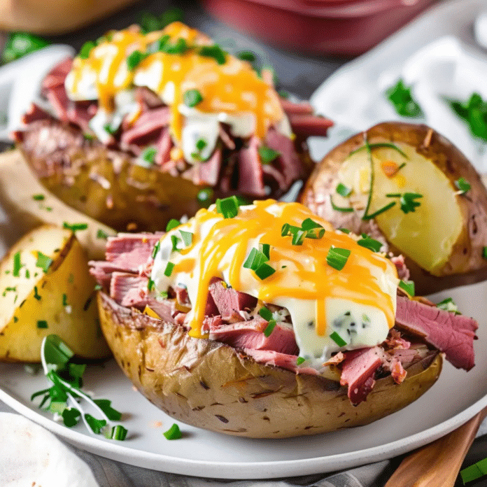 Corned Beef Baked Potatoes are the perfect fusion of two comfort food classics, combining tender, fluffy baked potatoes with the savory richness of corned beef. The corned beef is sautéed with onions and garlic, then piled high on crispy baked potatoes, creating a hearty, filling meal that’s both flavorful and satisfying. Topped with melted cheese, a dollop of sour cream, and a sprinkle of fresh chives, this dish is perfect for St. Patrick’s Day or any time you’re craving a cozy, indulgent dinner. It’s an easy, delicious way to transform leftovers or make a new twist on traditional corned beef.