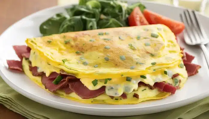 Corned Beef Omelet is a hearty and satisfying breakfast dish that combines the rich, savory flavors of corned beef with the light and fluffy texture of a classic omelet. This dish is perfect for using up leftover corned beef, turning it into a delicious morning meal that’s both filling and full of flavor. The corned beef is sautéed with onions and peppers to create a flavorful base, which is then enveloped in a soft omelet, creating a perfect balance of textures and tastes. Whether you’re looking for a weekend brunch idea or a protein-packed breakfast, this corned beef omelet is sure to hit the spot. Pair it with toast or a fresh salad for a complete meal.