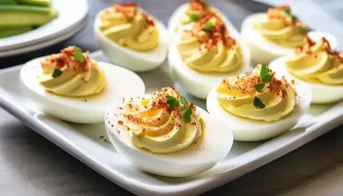 - Garnish and Serve: Lightly sprinkle the tops of the deviled eggs with paprika. Garnish with chopped fresh chives or dill, if desired. Serve immediately or refrigerate until ready to serve.