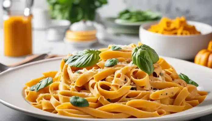 - Serve: Divide the creamy pumpkin pasta among serving plates. Garnish with fresh parsley or sage leaves and additional Parmesan cheese if desired.
