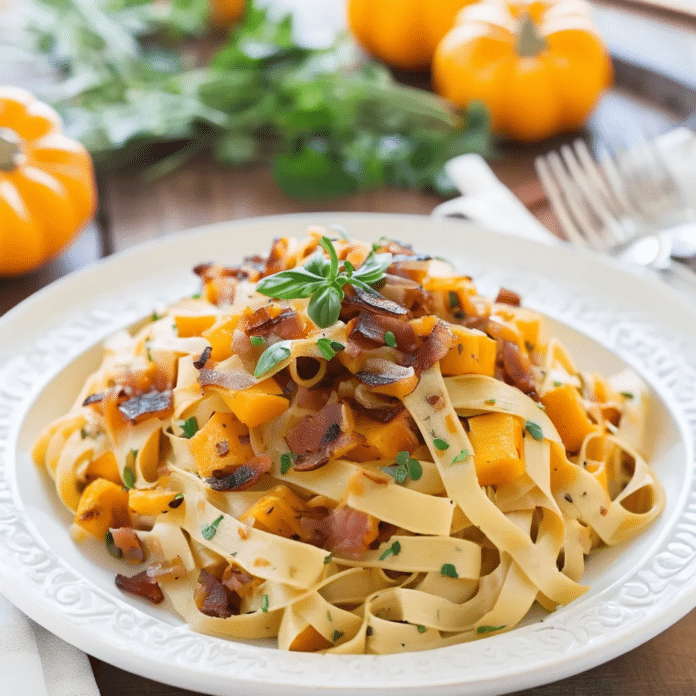 Creamy Squash Fettuccine with Caramelized Onion and Pancetta is a rich and flavorful pasta dish that combines the natural sweetness of roasted squash with the savory notes of pancetta and deeply caramelized onions. The velvety squash sauce coats each strand of fettuccine, while the crispy pancetta adds a delightful contrast of texture and flavor. This dish is a perfect blend of comforting and gourmet, making it ideal for both weeknight dinners and special occasions.