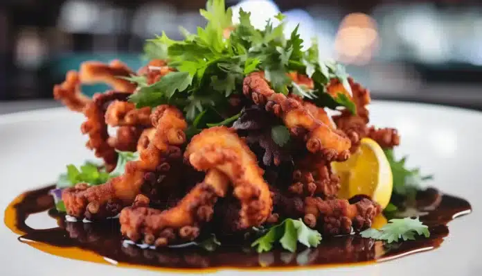 - Fry the Octopus: Heat vegetable oil in a large frying pan over medium-high heat. Once the oil is hot, fry the octopus in batches for 2-3 minutes on each side, or until golden brown and crispy.