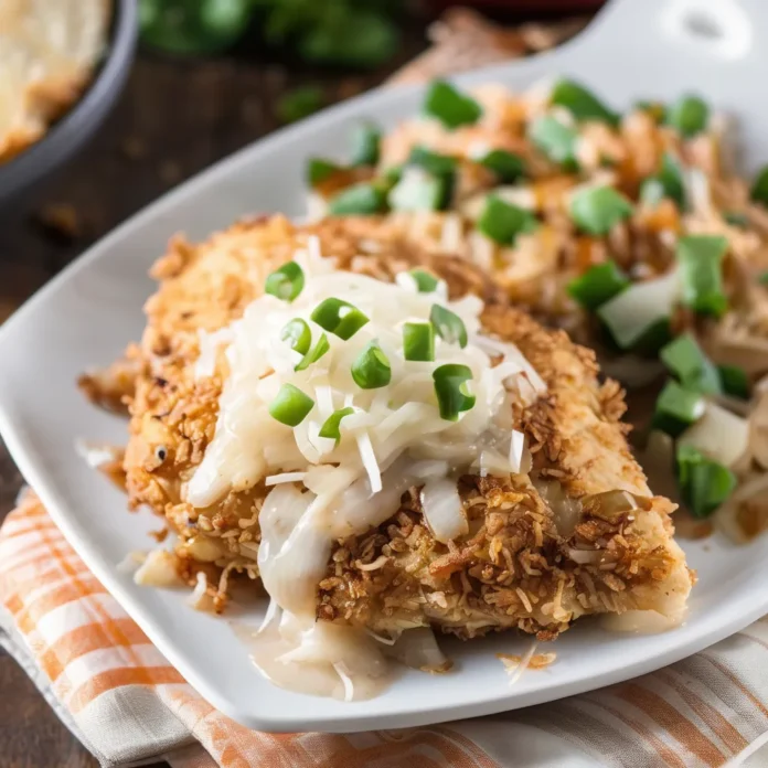 Crunchy French Onion Chicken is a delicious and easy-to-make dish that combines the savory flavors of French onion soup with crispy, juicy chicken. This recipe features chicken breasts coated in a flavorful mixture of French onion soup mix and crispy breadcrumbs, then baked to golden perfection. The result is a dish that’s crunchy on the outside and tender on the inside, with a delightful burst of onion flavor in every bite. Perfect for a weeknight dinner or a special occasion, this dish pairs well with mashed potatoes, steamed vegetables, or a fresh salad for a complete and satisfying meal.