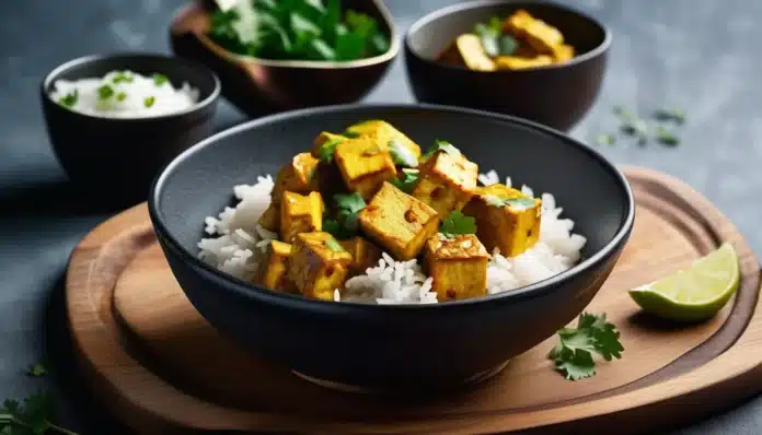 Curried Tofu with Rice is a delicious and nourishing dish that brings together the rich, aromatic flavors of curry with the satisfying texture of tofu. This plant-based meal features tofu cubes simmered in a fragrant curry sauce made with coconut milk, spices, and fresh vegetables, creating a creamy and flavorful dish that’s both hearty and healthy. Served over a bed of steamed rice, this curried tofu is perfect for a weeknight dinner or meal prep, offering a delightful combination of tastes and textures that will please vegans and non-vegans alike. Easy to prepare and full of vibrant flavors, Curried Tofu with Rice is sure to become a staple in your recipe collection.
