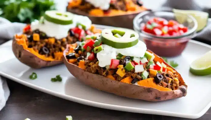 4. Stuff and top the sweet potatoes: Spoon the taco-seasoned beef mixture into each sweet potato, dividing it evenly. Top with shredded cheese, allowing it to melt over the warm filling. Add a dollop of sour cream or Greek yogurt, followed by salsa or diced tomatoes, chopped lettuce, cilantro, and any additional toppings like avocado, jalapeños, or guacamole.