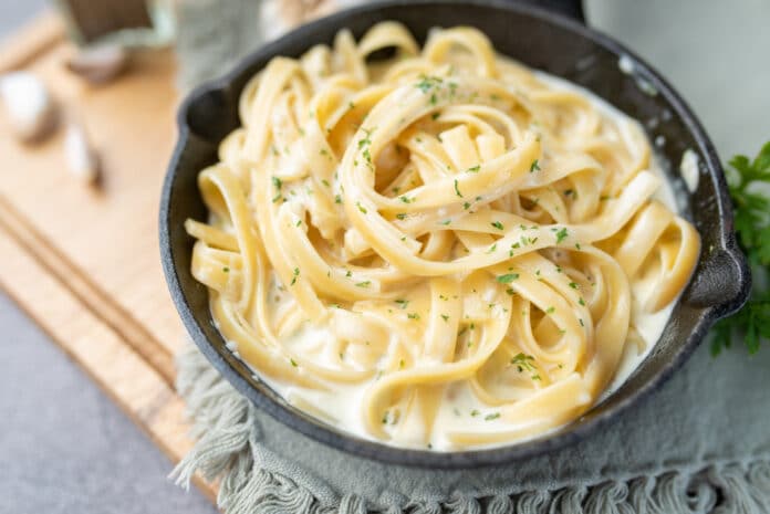 - Transfer the Fettuccine Alfredo to serving plates. Garnish with chopped fresh parsley and extra grated Parmesan cheese.