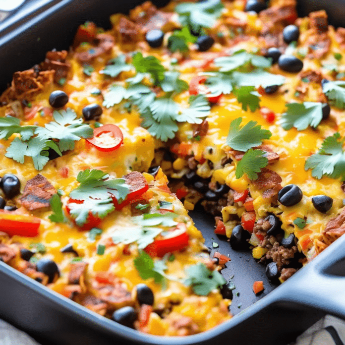 Fiesta Breakfast Bake is a vibrant and flavorful dish that brings a taste of the Southwest to your morning routine. This easy-to-make casserole is packed with savory ingredients like spicy chorizo sausage, fluffy scrambled eggs, black beans, and colorful bell peppers, all layered over a base of crispy hash browns. Topped with a generous amount of melted cheddar cheese and a sprinkle of fresh cilantro, this breakfast bake is both hearty and satisfying, perfect for feeding a crowd at brunch or enjoying as a weekend family breakfast. With its blend of zesty flavors and wholesome ingredients, Fiesta Breakfast Bake is sure to become a favorite way to start the day.