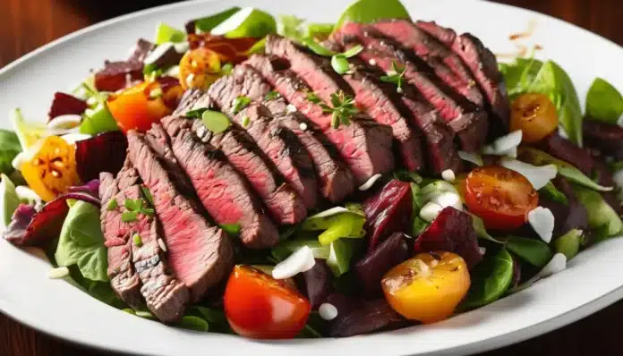 Serve immediately and enjoy this delicious, protein-packed Flat Iron Steak Salad!