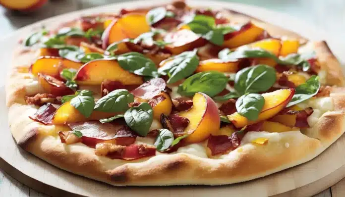 - Assemble the pizza: Spread the ricotta cheese evenly over the pizza dough. Sprinkle the shredded mozzarella on top. Arrange the fried peach slices and crispy pancetta over the cheese.