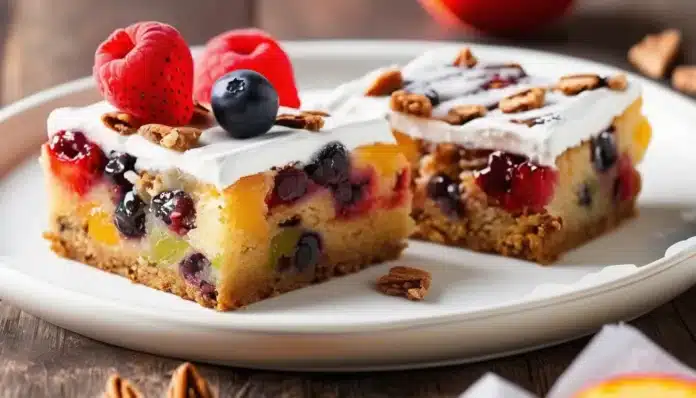 Fruit Cocktail Bars are a nostalgic, sweet treat that combines the flavors of a classic fruit cocktail with a moist, cake-like base. These bars are easy to make and perfect for sharing at potlucks, family gatherings, or as a delightful snack at home. The combination of the fruit cocktail’s juicy sweetness and the tender, buttery cake creates a deliciously satisfying dessert. Finished with a light glaze or a sprinkle of powdered sugar, these bars are as beautiful as they are tasty. They’re a great way to enjoy the mixed fruits in a dessert that’s both simple and comforting.