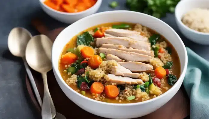 This Ginger Chicken and Quinoa Stew is a warming, nutrient-packed dish that’s perfect for chilly evenings. The aromatic ginger adds a touch of warmth and spice, perfectly complementing the tender chicken and wholesome quinoa. Vegetables like carrots, celery, and spinach bring both color and nutrition, making this stew as healthy as it is delicious. The quinoa not only thickens the stew but also adds a subtle nutty flavor, making it a complete and satisfying meal in a bowl. Ideal for meal prep or a comforting family dinner, this stew is both easy to make and full of flavor.